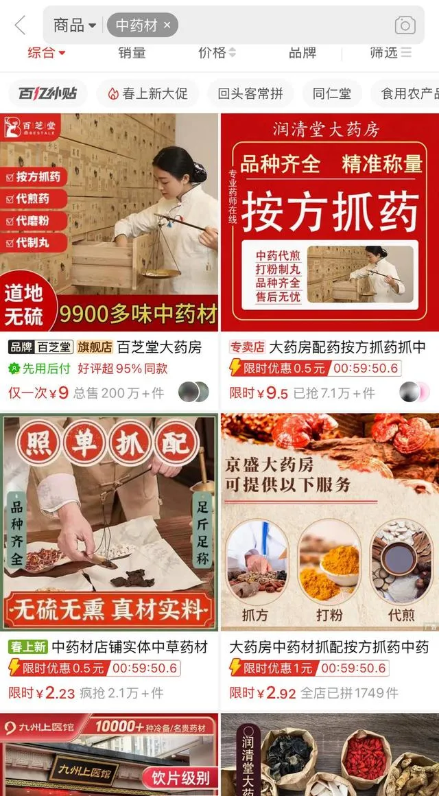 在親歷線下高價購藥後,也有人轉而嘗試網路購藥。記者開啟某網購平台,輸入關鍵詞「中藥」,琳瑯滿目的「中藥材店抓藥配藥」出現的頁面上。不少店鋪上寫著標語:「地道無硫,精準稱量。只出售藥材,不解釋藥效。」